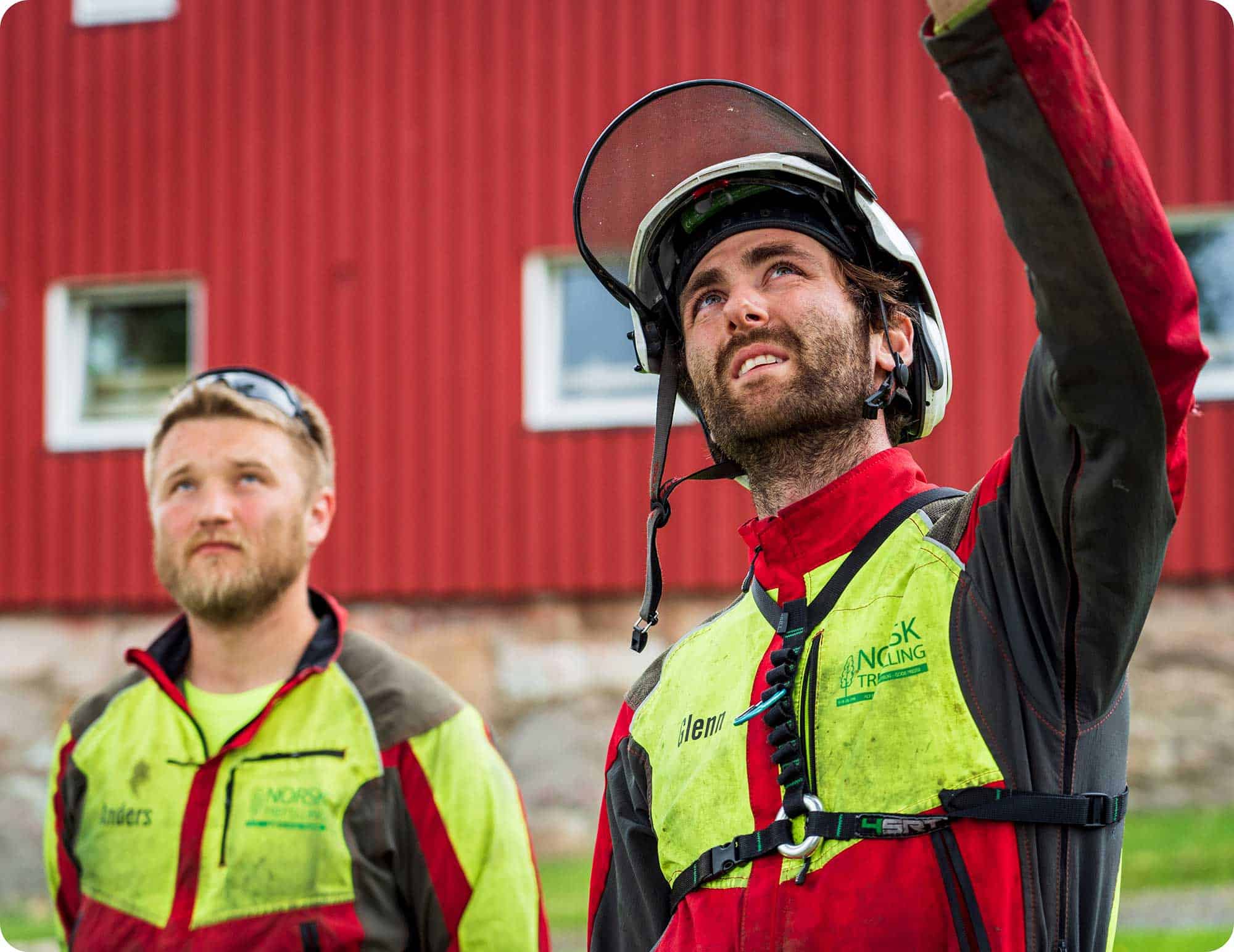 Ansatte fra Norsk Trefelling planlegger sikker trefelling ved en rød bygning.